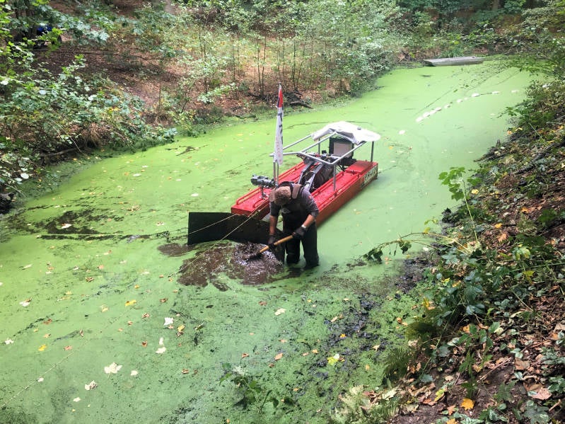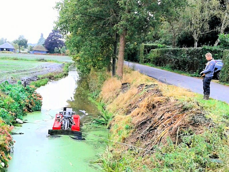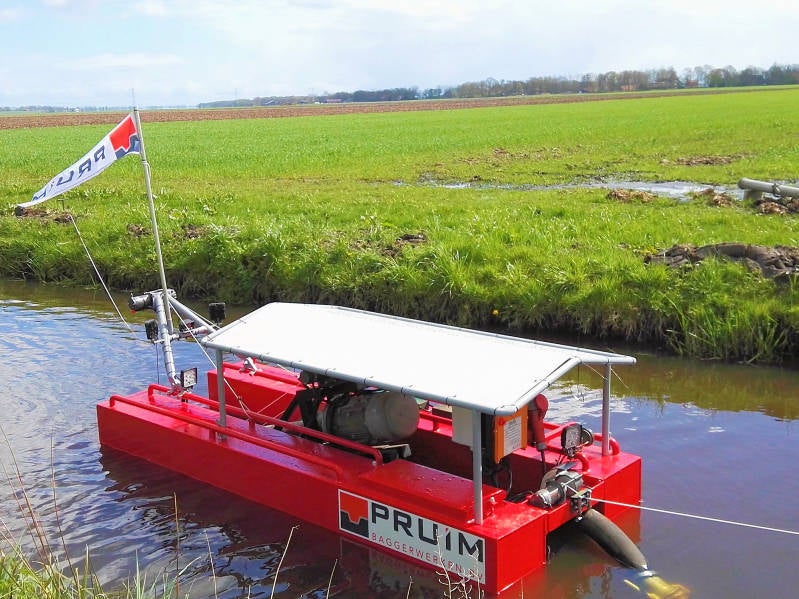 Op afstand bedienbaar, kleinste baggerzuigboot (3 x 0,80 m), 250 kg, diepgang van 30 cm, werkt op 400V, met kleine kraan in het water te zetten, woelt met roterend hakmes bodem schoon, baggermengsel kan tot 2 m diepte worden opgezogen, kan zonder tussenpomp met 4” pijpleiding tot enkele honderden meters transporteren.
